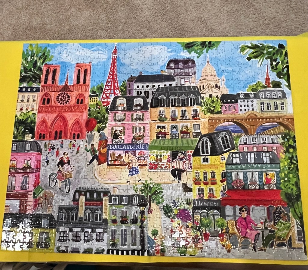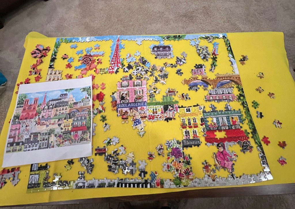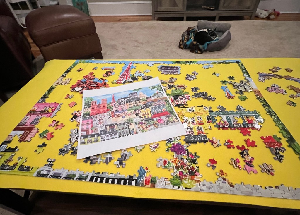 Altogether it took me about three weeks to complete. I didn’t work every evening, but when I did it was about an hour at a time. No one complained about it taking up space (I think that issue is all in my head). I didn’t lose any pieces although when I couldn’t find the last edge piece, I thought one was! I think what I enjoyed most was there was an end in sight right from the beginning.