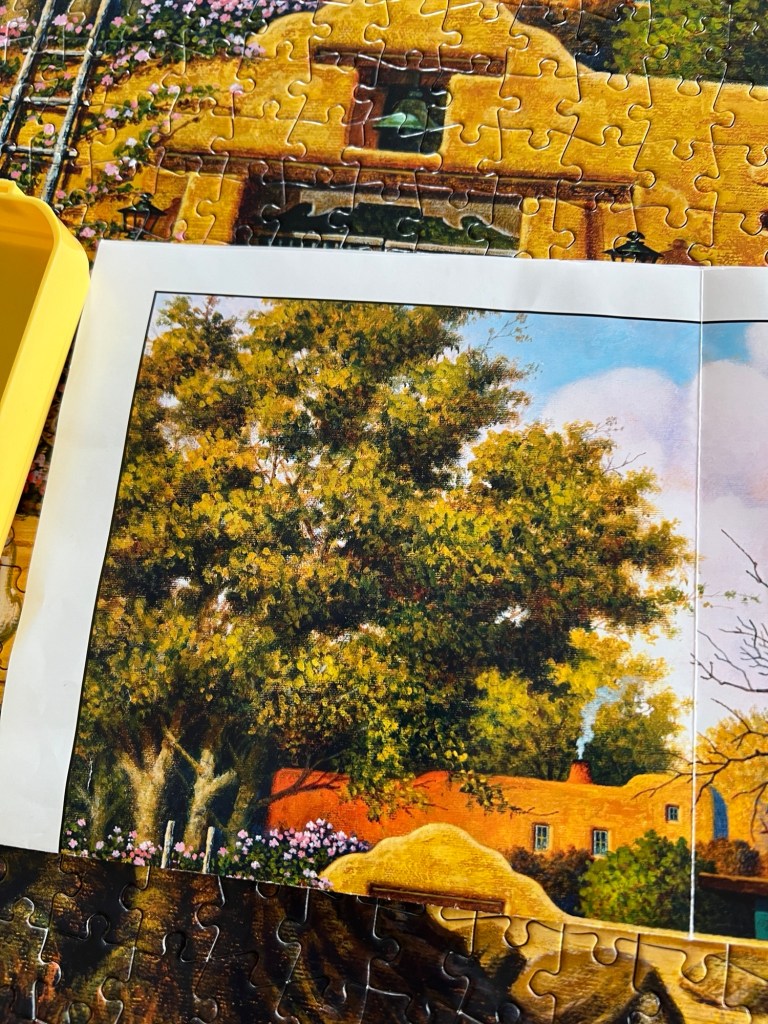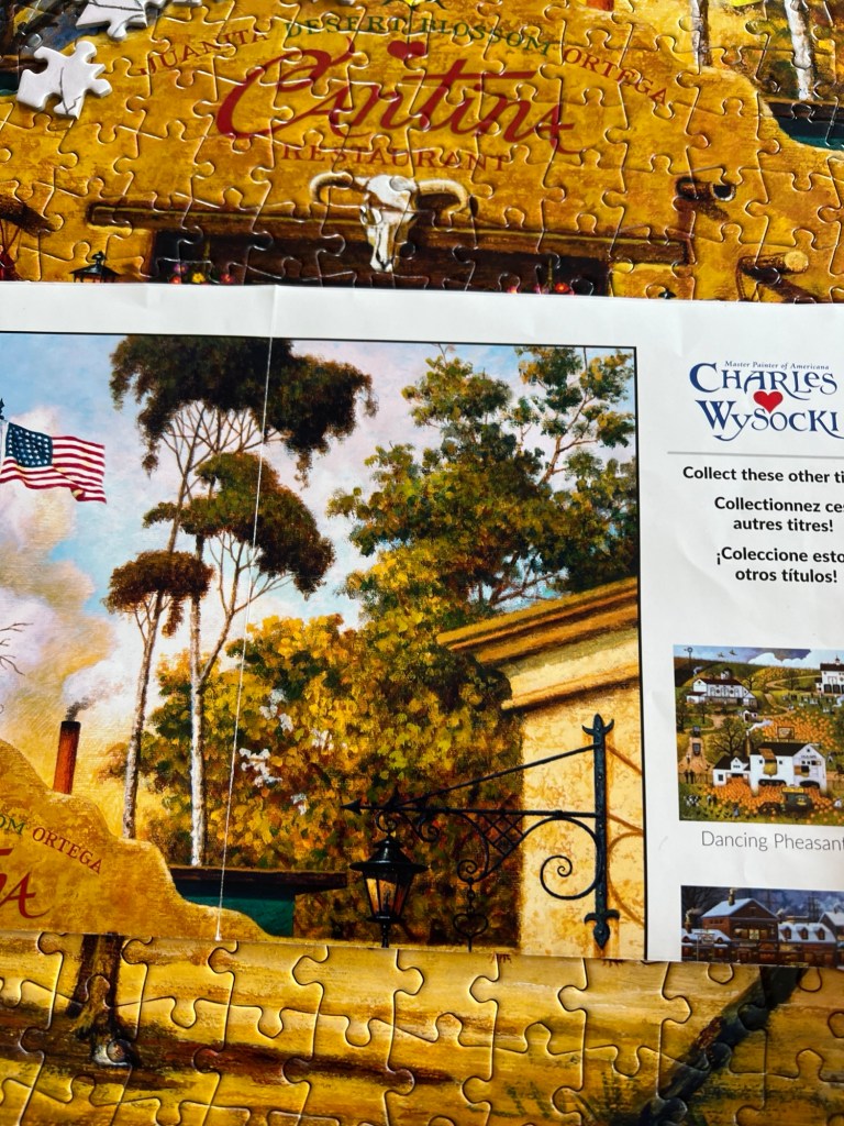 I ended up perusing the puzzle aisle of Walmart with my measurements and found this Buffalo Games and Puzzles Charles Wysocki puzzle called “Sunday Morning Stroll”.