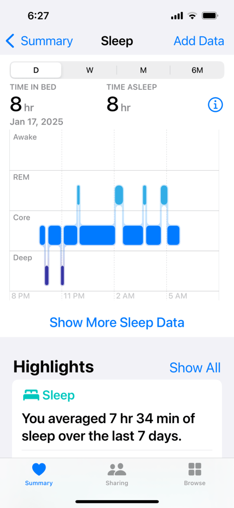 I know that sleep is important, and in our house it’s always been important to my husband! For most of our marriage, this man has gone to bed at 8pm and would get a good 8 hours of sleep. I would usually make it into bed by 10. Since the first, I’ve made an effort to head up by 9pm, get some reading in and have lights out by 9:30. I also started wearing my Apple Watch to bed so it can record the different stages of my sleep.