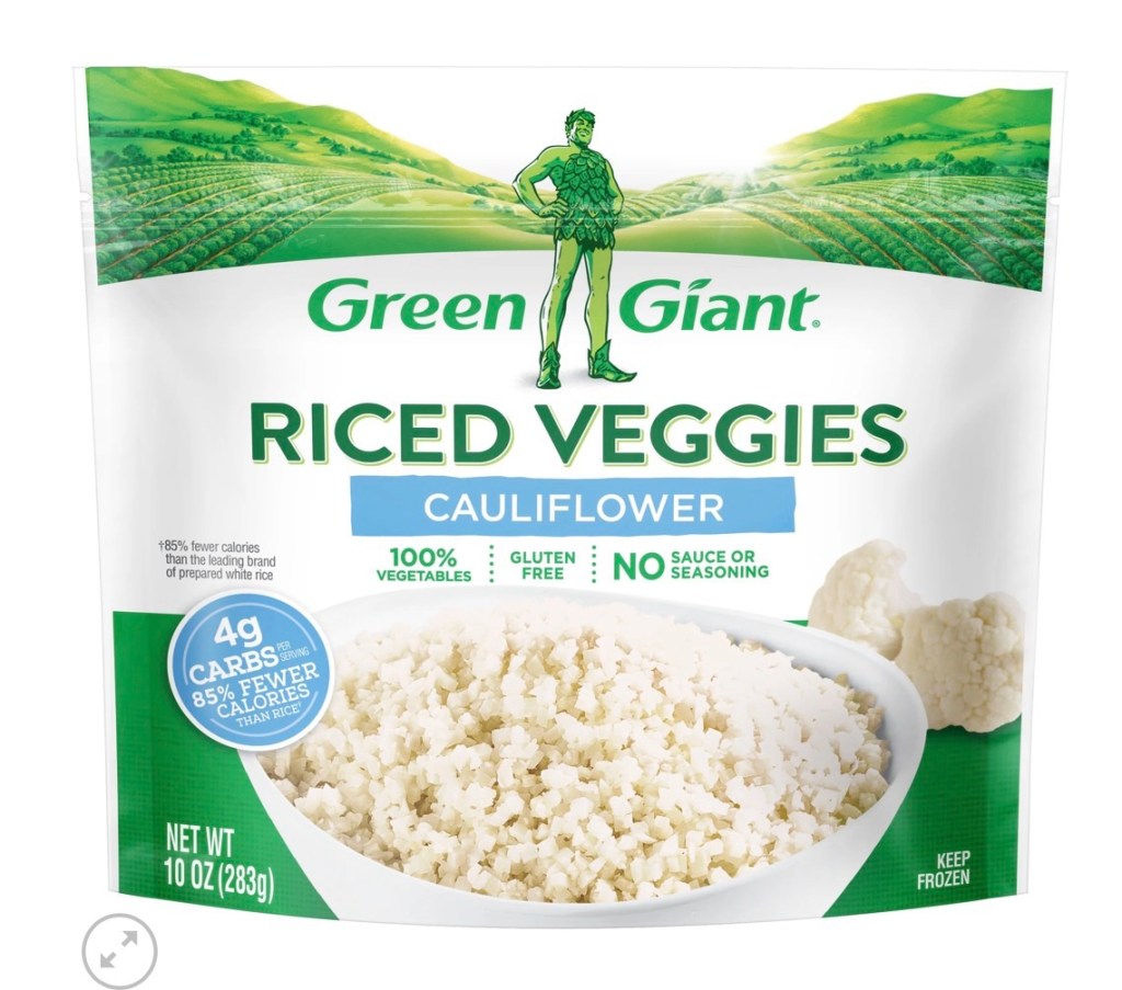Green Giant changed their packaging for Riced Cauliflower to “Riced Veggies” with a smaller caption three quarters of the way down to tell us it is Cauliflower.