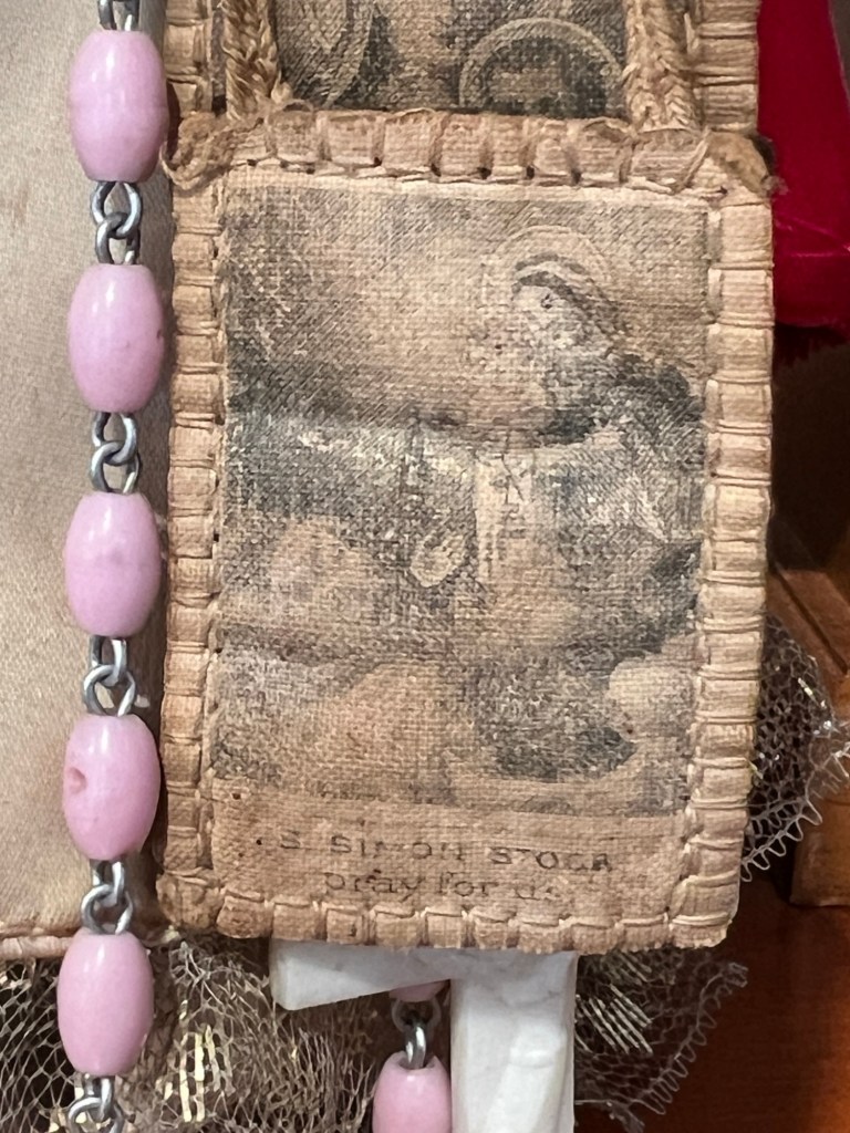 When I googled “Scapular”, this brown scapular came up immediately, as it is the most common form and is called the Scapular of Our Lady of Mount Carmel. One patch shows Our Lady of Mount Carmel, and the other shows St. Simon Stock. It’s also most likely the oldest.