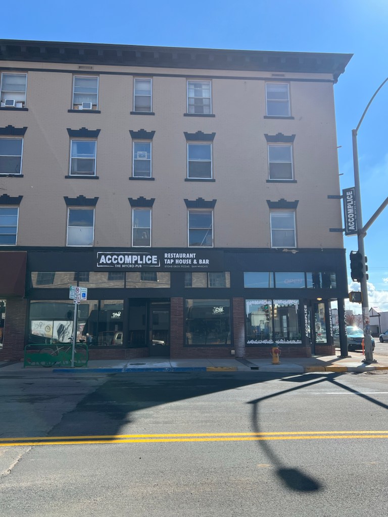Accomplice Beer Company in downtown Laramie is a bar / restaurant / brewery. No beers for us but we cozied up to the bar and had a delicious breakfast.